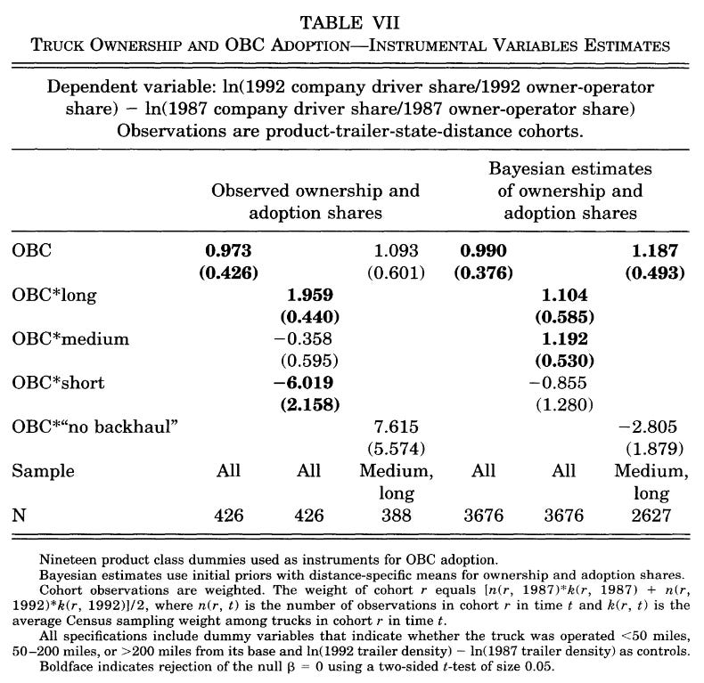 Abstract: We investigate how contractual incompleteness affects asset ownership in trucking by examining cross-sectional patterns in truck ownership and how truck ownership has changed with the diffusion of on-board computers (OBCs). We find that driver ownership of trucks is greater for long than short hauls, and when hauls require equipment for which demands are unidirectional rather than bidirectional. We then find that driver ownership decreases with OBC adoption, particularly for longer hauls. These results are consistent with the hypothesis that truck ownership reflects trade-offs between driving incentives and bargaining costs, and indicate that improvements in the contracting environment have led to less independent contracting and larger firms.