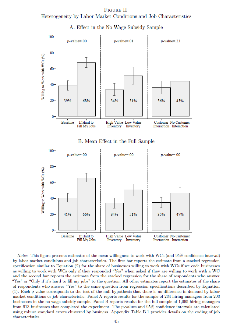 Abstract: We experimentally test several approaches to increasing the demand for workers with a criminal record on a nationwide staffing platform by addressing potential downside risk and productivity concerns. The staffing platform asked hiring managers to make a series of hypothetical hiring decisions that affected whether workers with a criminal record could accept their jobs in the future. We find that 39% of businesses in our sample are willing to work with individuals with a criminal record at baseline, which rises to over 50% when businesses are offered crime and safety insurance, a single performance review, or a limited background check covering just the past year. Wage subsidies can achieve similar increases but at a substantially higher cost. Based on our findings, the staffing platform relaxed the criminal background check requirement and offered crime and safety insurance to interested businesses.