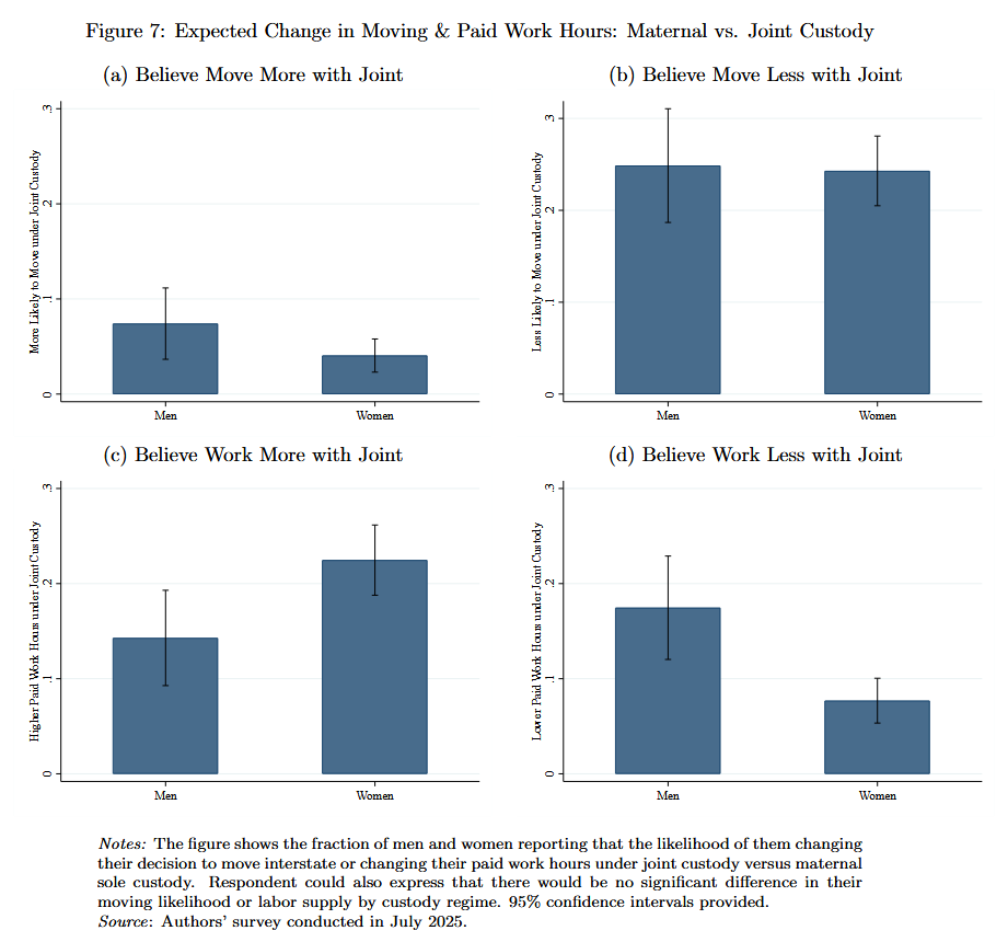 Abstract: Joint custody following divorce is widespread, but implementation is costly when individuals live in different states and so affects interstate mobility. Migration of separated fathers has fallen significantly more than that of married fathers. We show the causal effect of joint custody using two strategies. First, we survey separated parents to elicit beliefs about the likelihood of interstate moves. Second, we use the staggered adoption of joint custody laws across US states, and show a reduction in actual migration of 11 percentage points for fathers. For mothers, there is no impact on mobility but suggestive evidence of beneficial labor market outcomes.