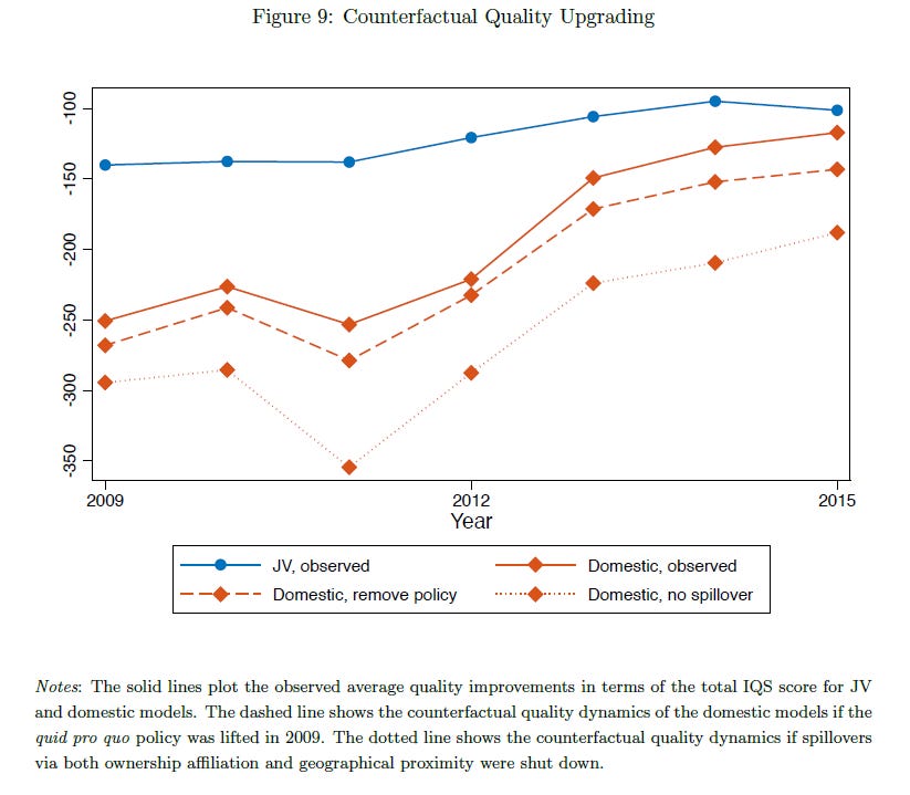 Abstract: Are quid pro quo (technology for market access) policies effective in facilitating knowledge spillover to developing countries? We study this question in the context of the Chinese automobile industry where foreign firms are required to set up joint ventures with domestic firms in return for market access. Using a unique dataset of detailed quality measures along multiple dimensions of vehicle performance, we document empirical patterns consistent with knowledge spillovers through both ownership affiliation and geographical proximity: joint ventures and Chinese domestic firms with ownership or location linkage tend to specialize in similar quality dimensions. The identification primarily relies on within-product variation across quality dimensions and the results are robust to a variety of specifications. The pattern is not driven by endogenous joint-venture network formation, overlapping customer base, or learning by doing considerations. Leveraging additional micro datasets on part suppliers and worker flow, we document that supplier network and labor mobility are important channels in mediating knowledge spillovers. However, these channels are not tied to ownership affiliations. Finally, we calibrate a simple learning model and conduct policy counterfactuals to examine the role of quid pro quo. Our findings show that ownership affiliation facilitates learning but quality improvement is primarily driven by the other mechanisms.