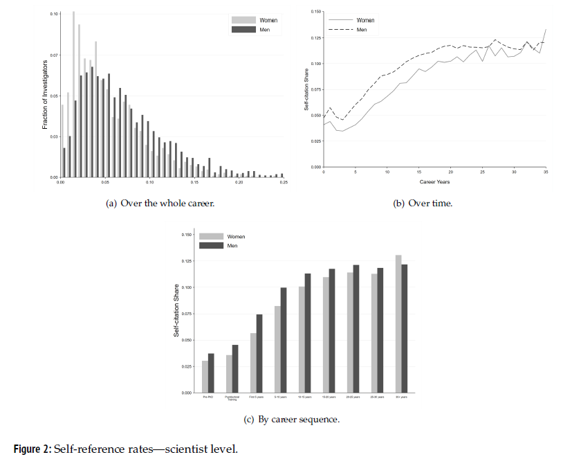Abstract: In science, self-citation is often interpreted as an act of self-promotion that (artificially) boosts the visibility of one’s prior work in the short term, which could then inflate professional authority in the long term. Recently, in light of research on the gender gap in self-promotion, two large-scale studies of publications examine if women self-cite less than men. But they arrive at conflicting conclusions; one concludes yes whereas the other, no. We join the debate with an original study of 36 cohorts of life scientists (1970–2005) followed through 2015 (or death or retirement). We track not only the rate of self-citation per unit of past productivity but also the likelihood of self-citing intellectually distant material and the rate of return on self-citations with respect to a host of major career outcomes, including grants, future citations, and job changes. With comprehensive, longitudinal data, we find no evidence whatsoever of a gender gap in self-citation practices or returns. Men may very well be more aggressive self-promoters than women, but this dynamic does not manifest in our sample with respect to self-citation practices. Implications of our null findings are discussed, particularly with respect to gender inequality in scientific careers more broadly.