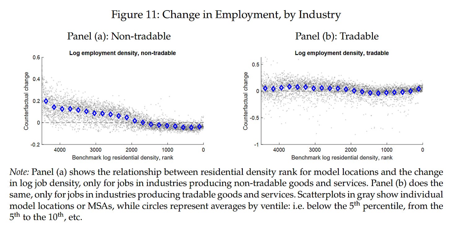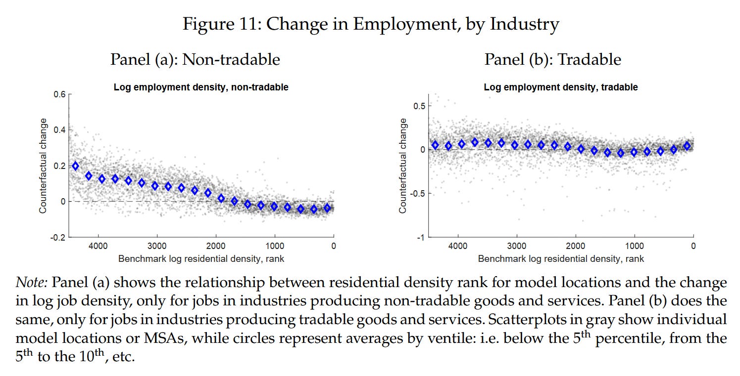 Jobs that produce nontradable outputs decentralize, following the population to the suburbs. Jobs that produce tradables either centralize more or decentralize to cheaper locations